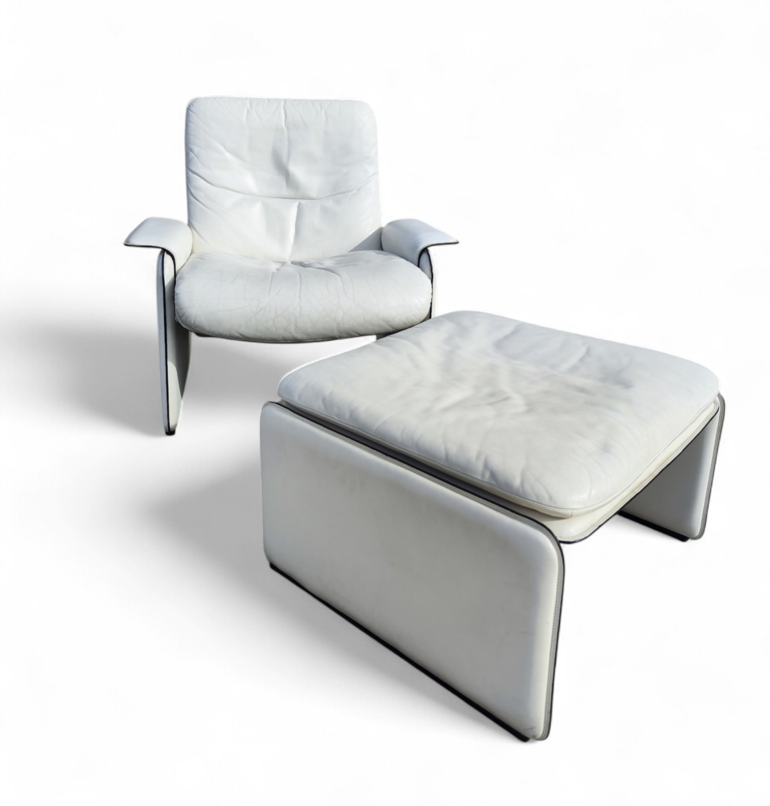 Introducing a distinguished De Sede armchair with matching ottoman, epitomizing modern elegance and unparalleled comfort. The pieces of De sede are crafted with precision, and enveloped in luxurious white leather, offering a sophisticated touch to any interior setting.