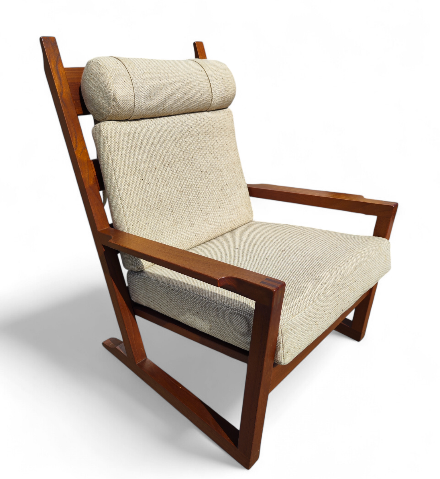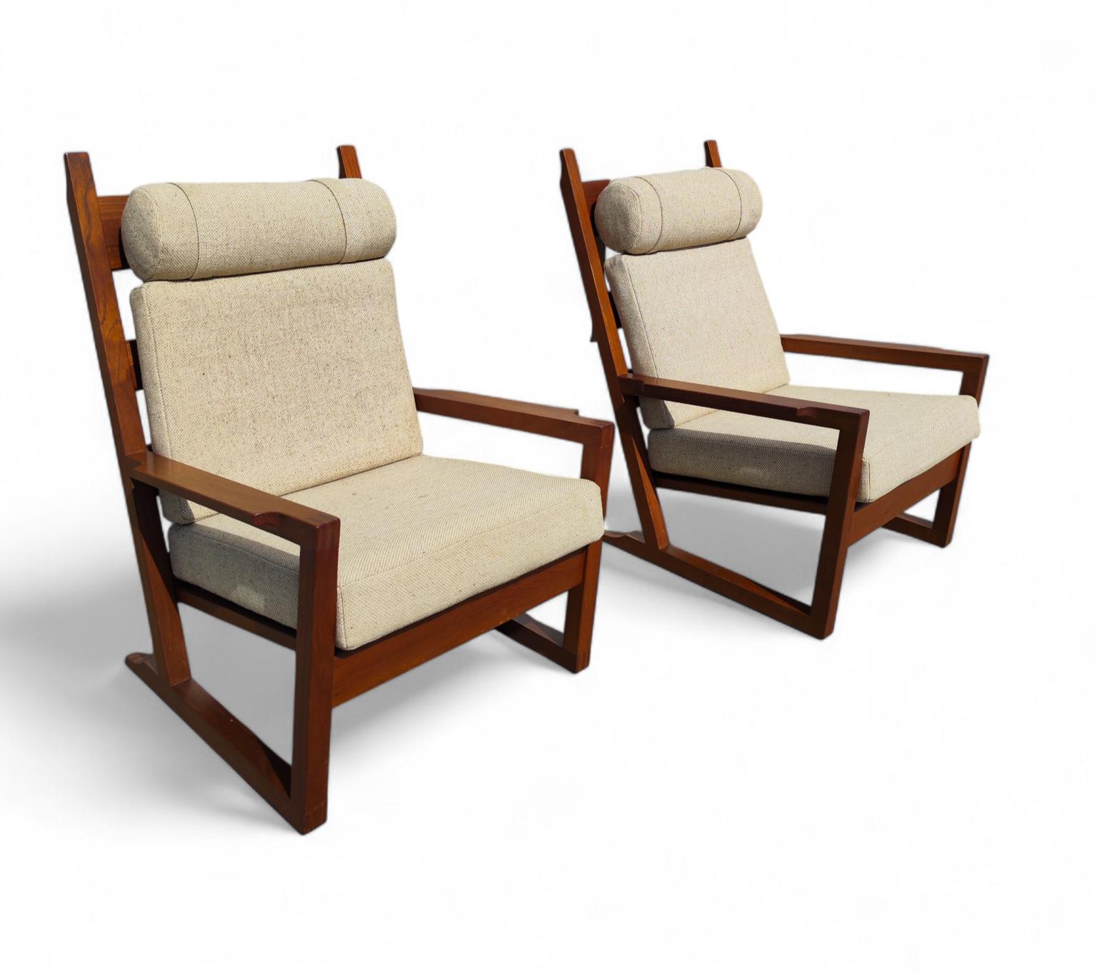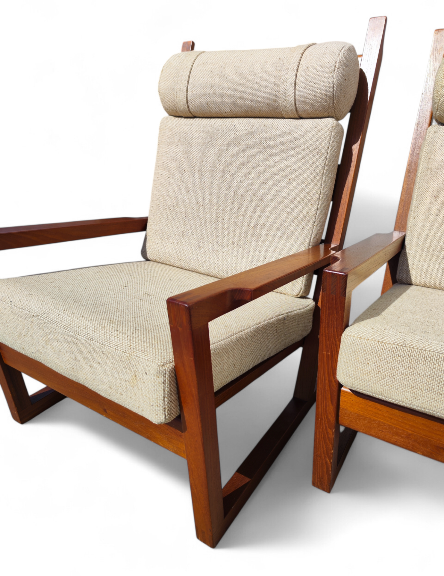 Immerse yourself in the timeless elegance of these Borge Mogensen armchairs, a quintessential representation of Mid Century Modern design. Crafted with precision, these chairs feature a robust wooden frame that exudes warmth and sophistication, perfectly complemented by the soft beige upholstery that promises comfort and style.